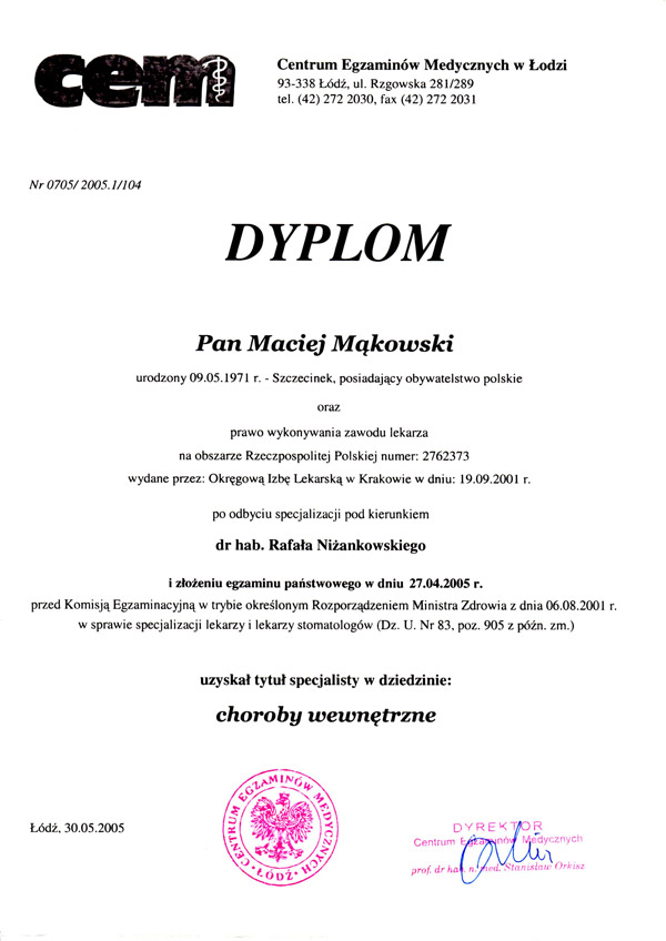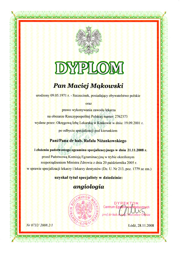 Celem ciągłego podnoszenia poziomu swojej wiedzy i oferowania Państwu aktualnego spojrzenia na choroby układu sercowo-naczyniowego, jestem w trakcie ostatniego roku szkolenia w dziedzinie kardiologii (Klinika Choroby Wieńcowej i Niewydolności Serca Szpitala Jana Pawła II w Krakowie).